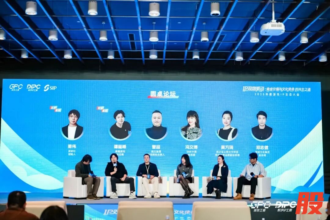 盛趣游戏副总裁谭雁峰(左二)在2025年度游戏IP生态大会圆桌论坛发言