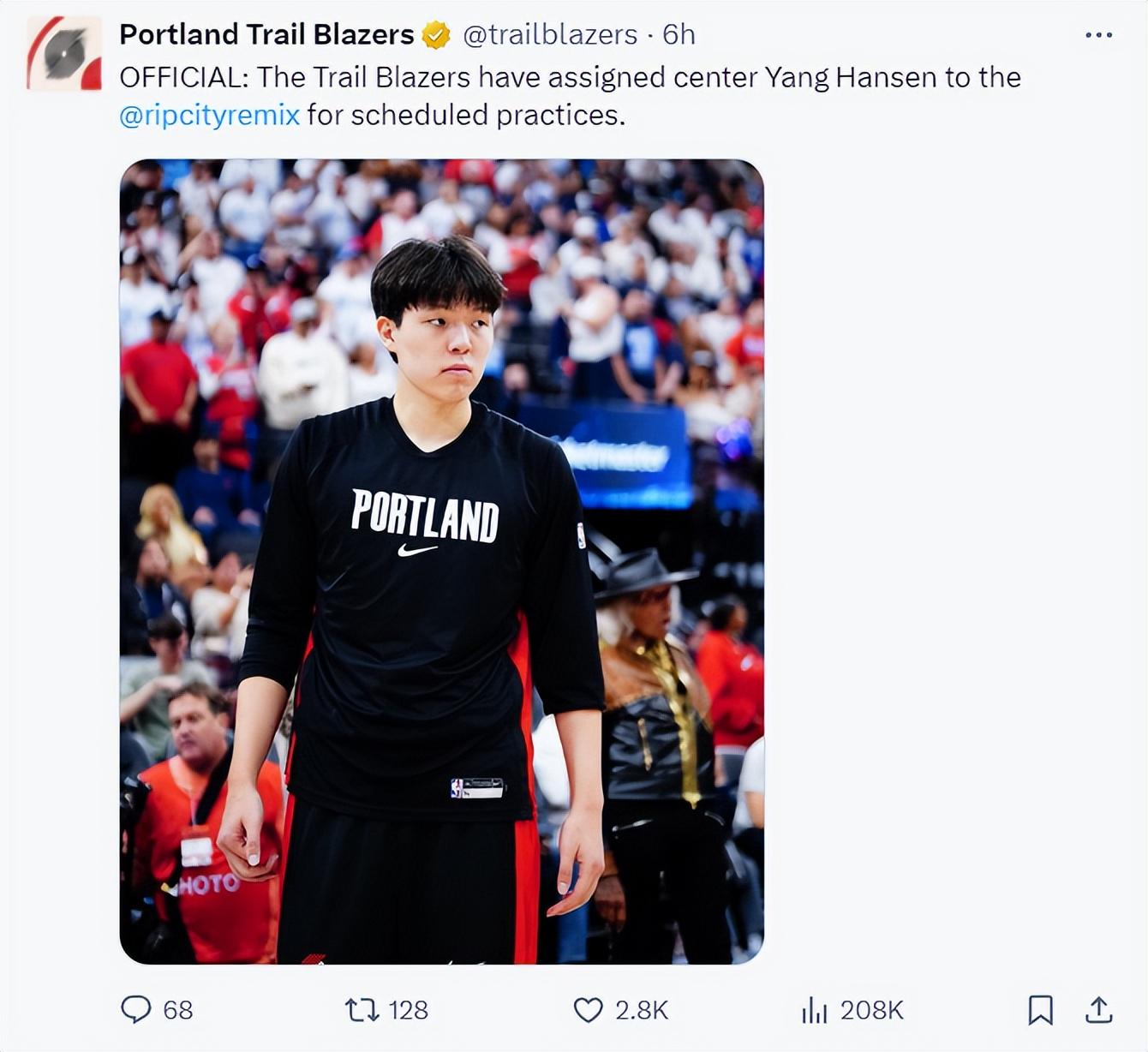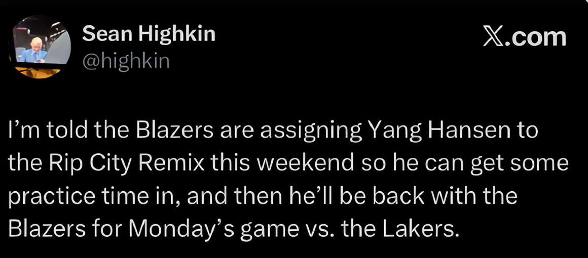 根据开拓者记者Sean Highkin的报道,杨瀚森在被下放发展联盟后会在混音队训练,在开拓者11月4日主场对阵湖人的比赛中再度将杨瀚森召回。