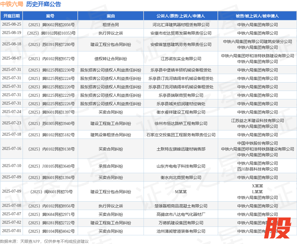 本站消息永華证券,根据天眼查APP显示,近日公布了一则中铁六局集团有限公司作为被告/被上诉人的开庭公告,详细内容如下:
