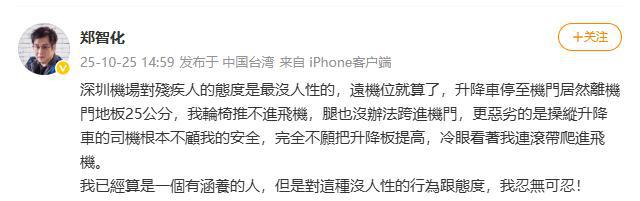 每经快讯,10 月 25 日下午,歌手郑智化在微博发文牛在线,称深圳机场对残疾人的态度没人性,升降车离机门地板 25 公分,他的轮椅推不进飞机,腿也跨不进机舱门,操纵升降车的司机完全不愿把升降板提高,冷眼看着他连滚带爬进飞机。25 日 18:05,深圳机场在郑智化微博下留言致歉,表示已关注到他反映的情况,并对现场服务给郑智化带来的不便和困扰深表歉意。对于相关问题,深圳机场方面已第一时间会同航空公司启动核查。